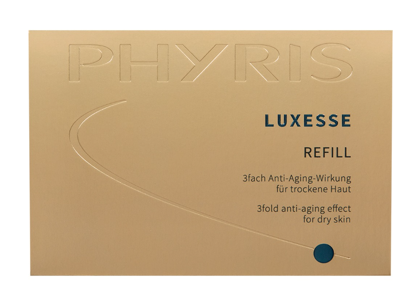 Phyris Luxesse Refill is een romige, zachte 24 uurs verzorging met 3-voudig anti-age effect voor de droge huid: direct, op middellange en op lange termijn. Phyris Luxesse Silk geeft onmiddelijke hydratatie, maakt glad en reduceert de diepte van de rimpels en zorgt op lange termijn voor stevige contouren. Het extract van de zwarte South Sea Pearls verfijnt met zijn zijdezachte glans de uitstraling van de huid. Red Algae extract zorgt voor onmiddelijke versteviging en intensieve hydratatie. Para Cress-extract vermindert expressielijnen en Southernwood extract verbetert de lipidesynthese en verstevigt de contouren.